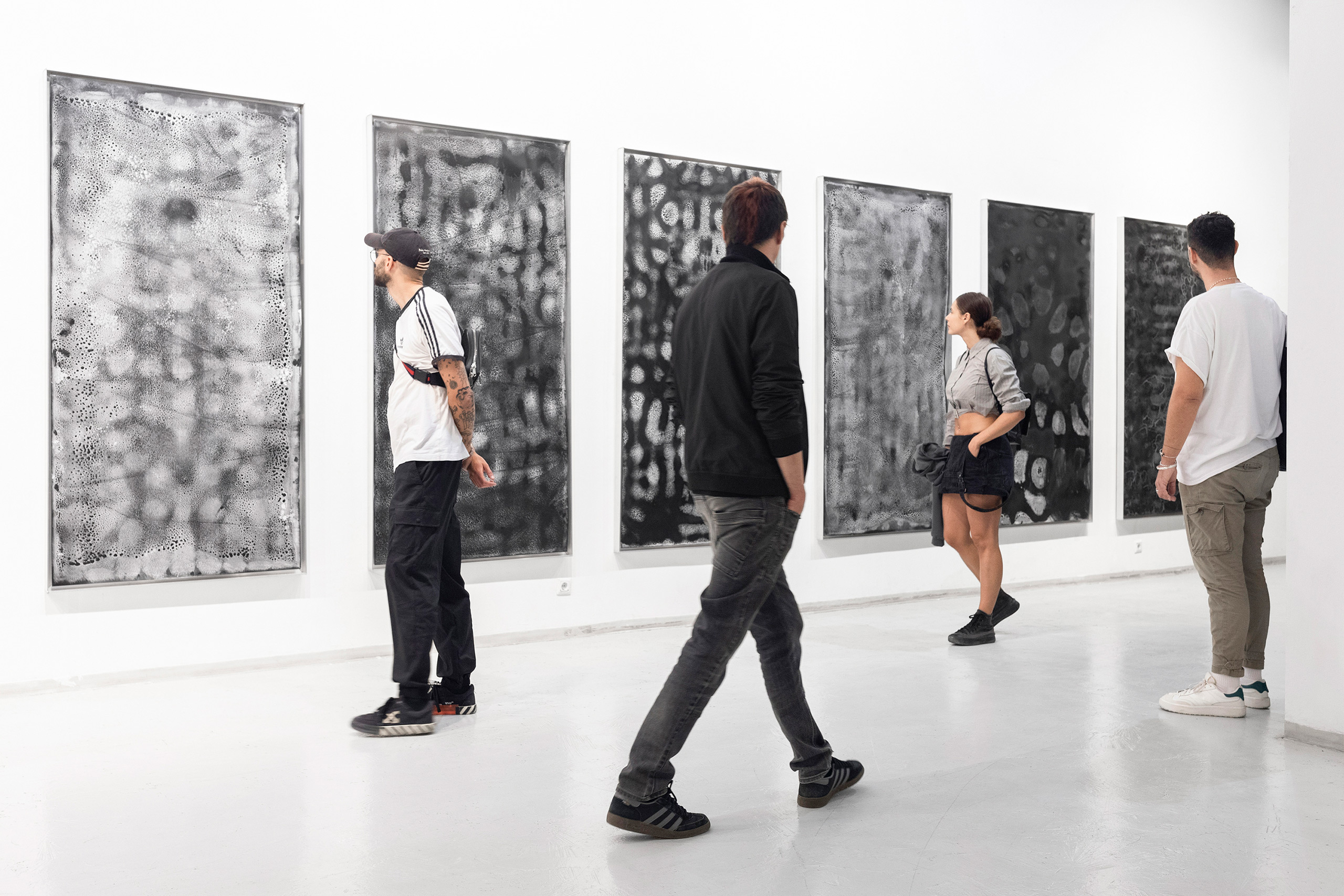 The series of works “Sound Imprints” uses a self-initiated technique of stochastic painting, a kind of hybrid of a Chladni plate and an analogue laser printer.